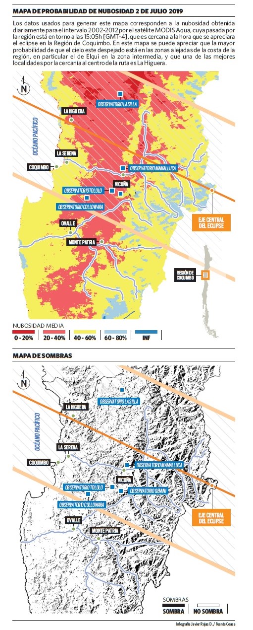 Para ello, los científicos del Ceaza también elaboraron un mapa de sombras que pretende también adelantarse a estas eventualidades. “En localidades como Pisco Elqui, por ejemplo, puede darse que a esa hora se encuentre tapado. Pero lo que muestra en análisis, eso sí, es que se daría en sectores muy puntales, no se da en un gran área y habría que buscar las que sean las más adecuadas para la visualización”.